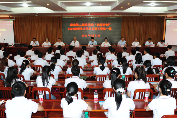 本网讯(通讯员 邓樱花)9月23日下午,学校在行政楼五号会议室举行“优师计划”2021级学生开学典礼暨开学第一课。湖北省教育厅教师处务俊华主任,副校长黄颂、夏力出席。相关职能部门和学院负责人、班主任参加。教务处处长田恒平主持典礼。