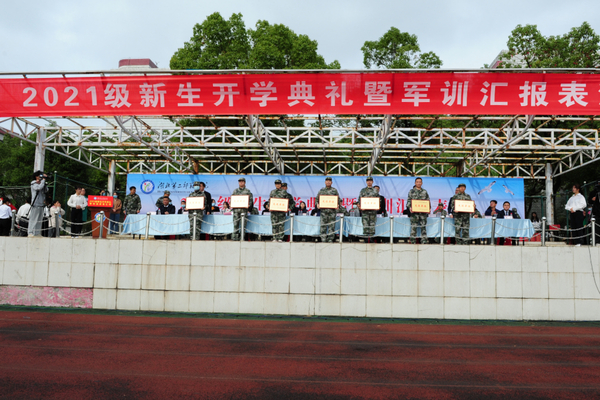 汇报表演结束后,工作人员宣读了《关于表彰2021年军训先进集体和先进个人的决定》,校领导为获奖集体及个人颁奖。