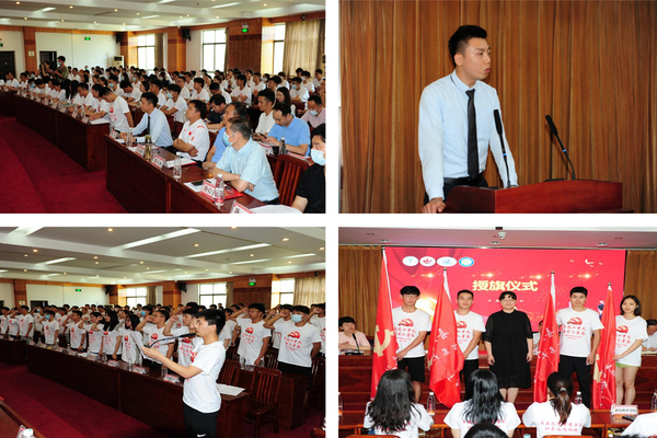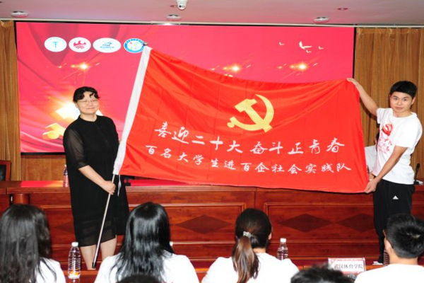 丁亚琳分别向中国地质大学、武汉体育学院、华中科技大学、beat365英国官网网站等实践队代表授旗。