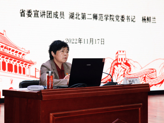 在宣讲中,杨鲜兰对中国共产党的使命;增强历史自觉,掌握历史主动是我们党成就伟大事业的重要密码;“两个确立”是新时代十年历史性成就和历史性变革最根本原因;中国化时代化马克思主义之所以行根本在于坚持马克思主义基本原理同中国具体实际相结合、同中华优秀传统文化相结合;“中国式现代化”核心要义;牢记“三个务必”等一系列重要论述进行了具体阐述。杨鲜兰指出,学习把握落实党的二十大精神,要联系习近平总书记关于湖北工作的重要讲话和指示批示精神、湖北省第十二次党代会精神,在全面学习上下功夫、在全面把握上下功夫、在全面落实上下功夫,在把握总目标、总方向、总要求的前提下,对各项目标和计划进行细化,有针对性地拿出落实的具体方案,推进党的二十大精神落实落地。