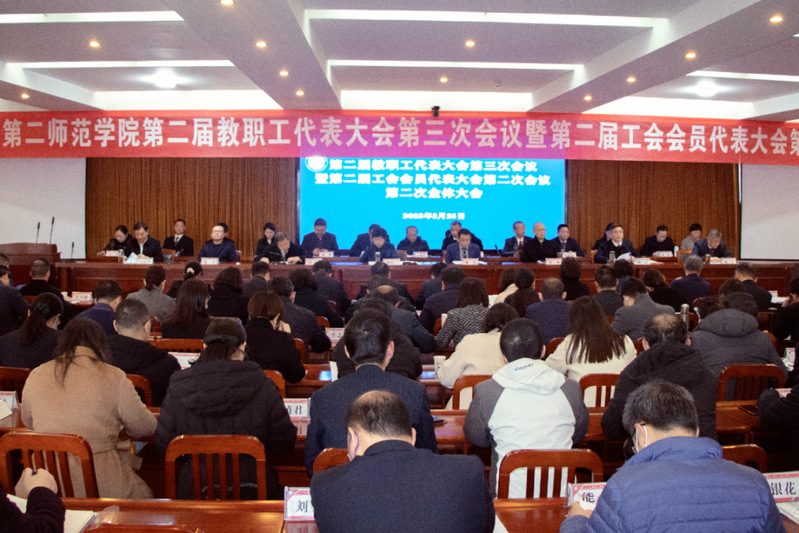 本网讯(学通社记者 龚杨依 黄仁飞)2月25日,学校在行政楼五号会议室隆重召开第二届教职工代表大会第三次会议暨第二届工会会员代表大会第二次会议(以下简称“两代会”)。107名正式代表出席会议、17名代表列席会议,大会由校党委常委副校长、工会主席陈勇主持。
