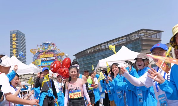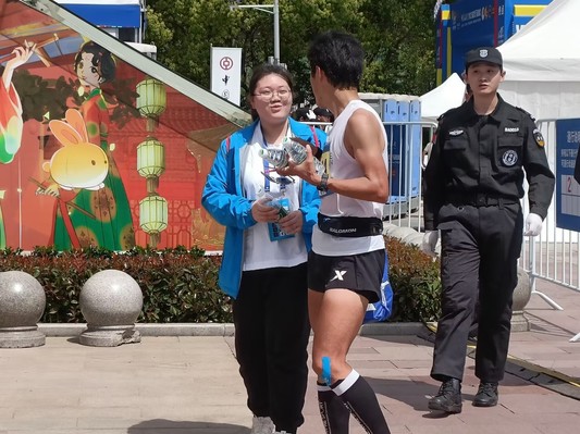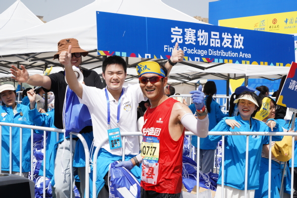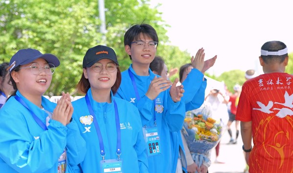 全程终点比赛内场区,终点物品发放组的志愿者们为在比赛规定时间内通过终点的选手颁发物资、纪念品和奖牌。马克思主义学院2021级思想政治教育2班的李柏翰说:“同学们克服了早起的疲倦,在颁发物资的工作中时刻充满激情,为选手们呐喊打气。每一位完赛的选手都向我们表达了感谢,这让我们更加充满了干劲!这是一段难忘的、美好的志愿服务经历!”