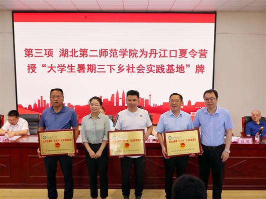 在开营仪式上,beat365官网向丹江口思源实验学校、大坝教育集团学校、红旗教育集团学校授“大学生暑期‘三下乡’社会实践基地”牌,并为基地校学生代表发放“爱心礼包”和开营物资。