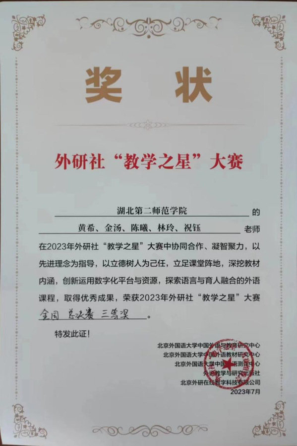 本网讯(通讯员 伍晓飞)近日,beat365官网外国语学院英语专业组教师团队(成员:黄希、金汤、陈曦、林玲、祝钰)参加2023年外研社“教学之星”大赛,荣获全国总决赛三等奖。