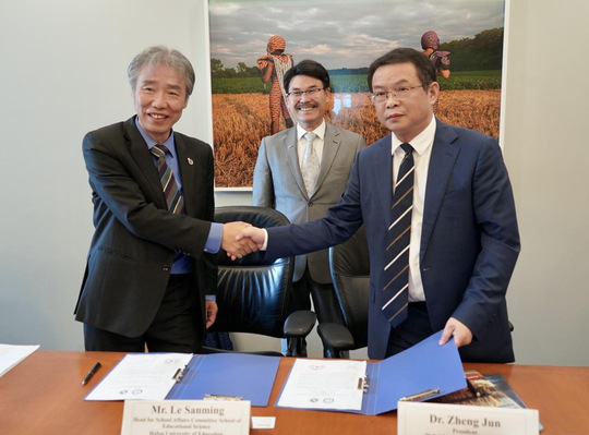 (图为郑军与陆跃锋校长签署合作备忘录)