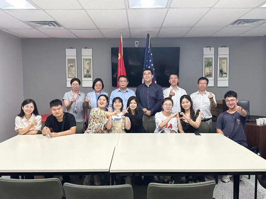 (图为郑军一行与留学东北州立大学的师生座谈交流)