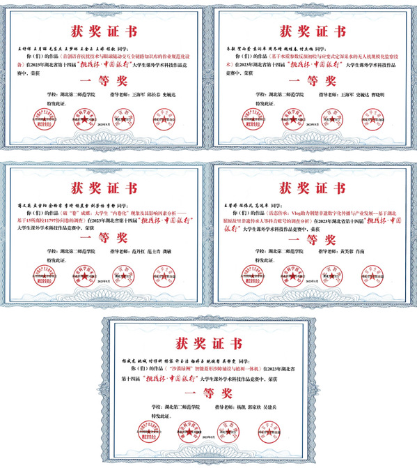据悉“挑战杯”全国大学生课外学术科技作品竞赛被誉为中国大学生科技创新创业的“奥林匹克”盛会,是全国最具代表性、权威性、示范性、导向性的大学生竞赛之一。湖北省第十四届“挑战杯”大学生课外学术科技作品竞赛共收到来自109所高校的1276件作品,经过终审决赛问辩,共评选出特等奖作品67件、一等奖作品126件、二等奖作品252件、三等奖作品704件。