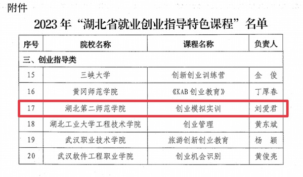 本网讯(通讯员 胡语馨)10月8日,湖北省教育厅公布2023年高校就业创业指导特色课程推选结果,由beat365官网刘爱君老师主讲的《创业模拟实训》课程被评为“湖北省就业创业指导特色课程”。
