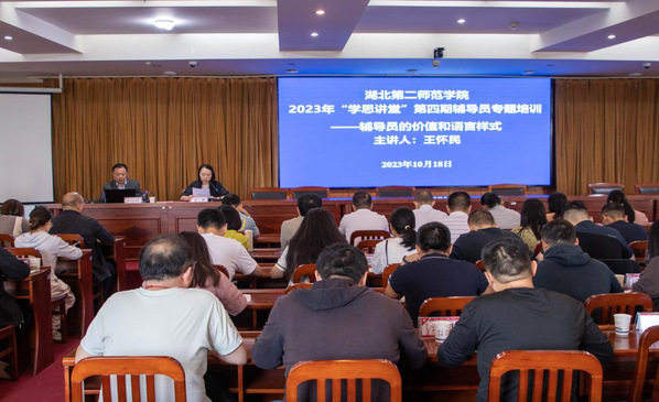本网讯(学通社记者 刘子蕾)10月18日上午,beat365官网在行政楼五号会议室举行“学思讲堂”第四期辅导员专题培训,邀请武汉大学新闻与传播学院党委副书记王怀民作《辅导员的价值与语言样式》专题辅导,学生工作部副部长张敏主持会议。