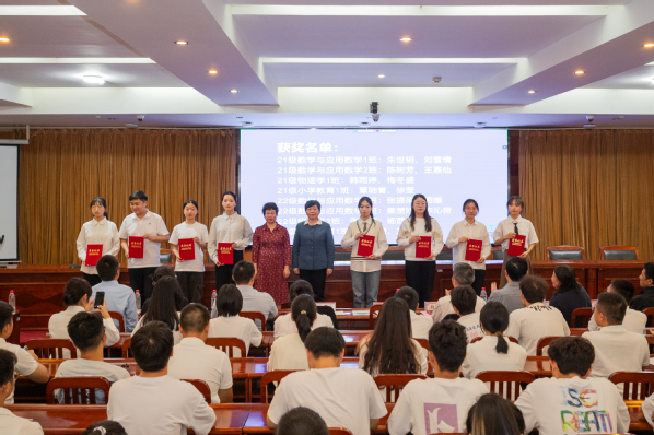 教师教师教育学院院长王勇宣读《关于表彰2022-2023学年“优师计划”奖学金获得者的决定》,杨鲜兰、叶菊莲为获奖学生颁奖。