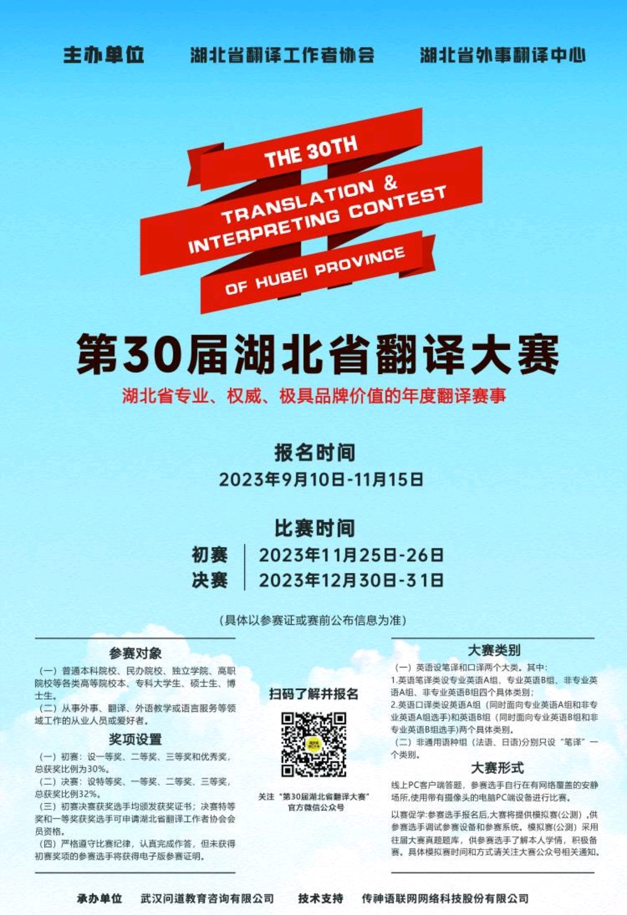 1.为贯彻大赛以赛促学,以赛代练宗旨,特开放第25-29届湖北省翻译大赛真题题库,供参赛选手练习、备赛和选择参赛组别。题库开放时间截止为11月中旬。(根据考务准备工作开始时间确定)