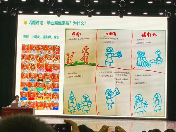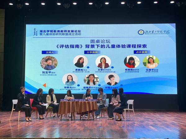 在圆桌论坛中,华中师范大学幼儿园园长刘玉平带领5位省市级示范园园长书记围绕“《评估指南》背景下的儿童体验课程探索”主题进行现场交流。