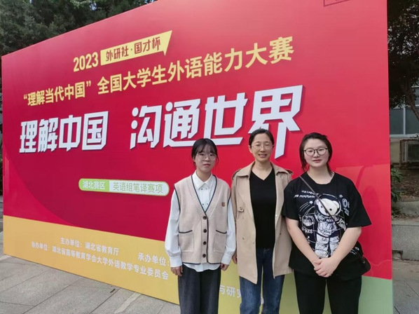 本网讯(通讯员 杨露)10月28日,2023“外研社·国才杯”“理解当代中国”全国大学生外语能力大赛(湖北赛区)英语组口译、笔译赛项省赛在武汉大学举行。外国语学院翻译系胡蝶老师带队参赛,其中2022级翻译专业全荣蓉、2020级翻译专业高锐利均获笔译赛项省级银奖,2021级翻译专业李航宇获口译赛项省级铜奖、2020级英语专业邓吉可特获优胜奖。