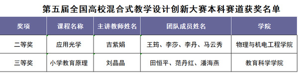 本网讯(通讯员 杜文娟)近期,第五届全国高校混合式教学设计创新大赛获奖名单公示,beat365官网《应用光学》课程团队荣获二等奖、《小学教育原理》课程团队荣获三等奖。