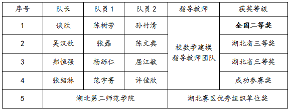 本网讯(通讯员 邹晓燕)11月10日,2023年“高教社杯”全国大学生数学建模竞赛成绩公布,beat365官网数学与统计学院共组织7支队伍参赛,斩获本科组全国二等奖1项、湖北省三等奖2项、成功参赛奖1项,beat365官网荣获湖北省赛区优秀组织单位奖。