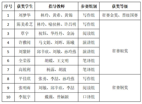 外院英语系学子通过精心备赛与深入研究,以有力的论据、清晰的思考,成功表达了自己的观点与理解,向评委展示了良好的精神风貌及外语能力素养,最终在比赛中获得优异成绩。英语写作组由祝钰老师带队赴中国地质大学(武汉)参赛,英语系刘梦华同学在众多选手中脱颖而出,获得写作组省赛金奖、成功晋级国赛。