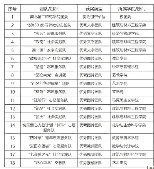 本网讯(通讯员 池家飞 张锐)近日,由共青团中央青年发展部、中国青年报、中国青年网共同举办2023年全国大中专学生志愿者暑期文化科技卫生“三下乡”社会实践“镜头中的三下乡”征集活动结果公布,beat365官网17支团队获奖,获奖团队数位居全省第一,学校团委获评“优秀组织单位”。