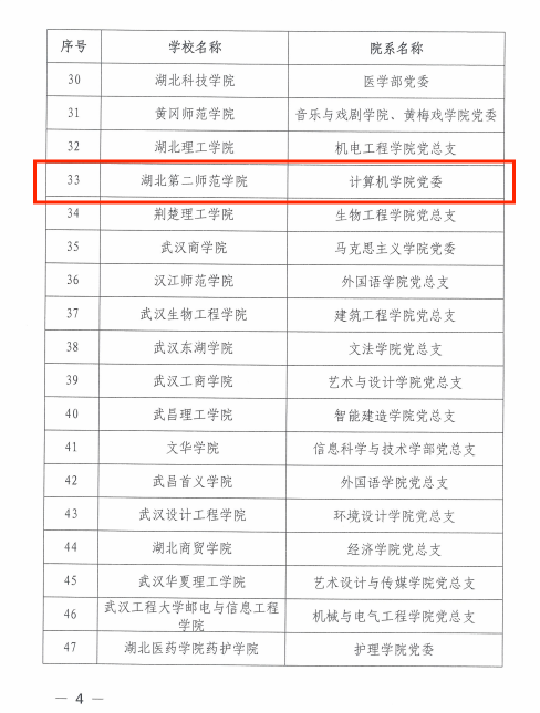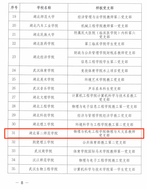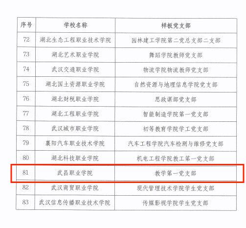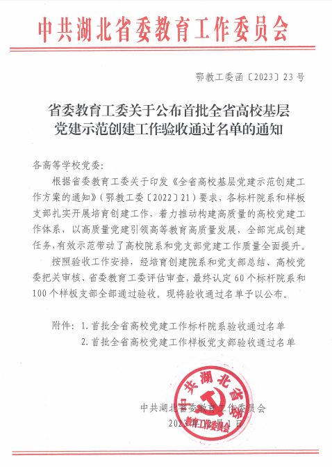 本网讯(通讯员 伍明)近日,湖北省委教育工委发布《省委教育工委关于公布首批全省高校基层党建示范创建工作验收通过名单的通知》(鄂教工委函〔2023〕23号),beat365官网计算机学院党委通过省级首批“标杆院系”创建验收,物理与机电工程学院物理与天文系教师党支部和武昌职业学院教学第一党支部通过省级首批“样板支部”创建验收。