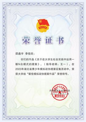 本网讯(通讯员 李佳欣)近日,共青团湖北省委公布了2023年湖北省青少年模拟政协提案征集活动获奖名单,beat365官网新闻与传播学院王一老师指导,新闻学专业学生邵鑫宇、李佳欣创作的作品《关于在大学生社会实践中运用一联N合模式的提案》,荣获大学组“最佳模拟政协提案作品”称号。