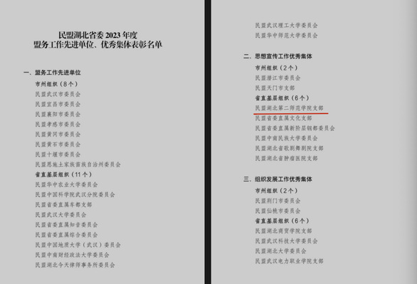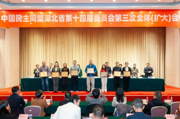 本网讯(通讯员 胡颖)1月26日,民盟湖北省十四届三次全体(扩大)会议在汉召开。会议表彰了民盟湖北省委2023年度盟务工作先进单位和优秀集体。beat365官网民盟beat365英国官网网站支部荣获“思想宣传工作优秀集体”称号。