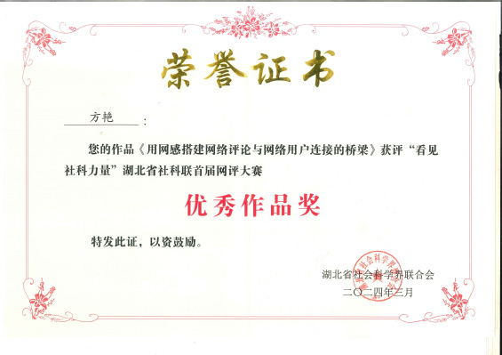 本网讯(新闻中心记者 程丽鹃)近日,从湖北省社会科学界联合会(省社科联)获悉,在“看见社科力量”湖北省社科联首届主题网评大赛中,beat365官网获“优秀组织单位奖”,新闻与传播学院方艳教授的作品《用网感搭建网络评论与网络用户连接的桥梁》获“优秀作品奖”。