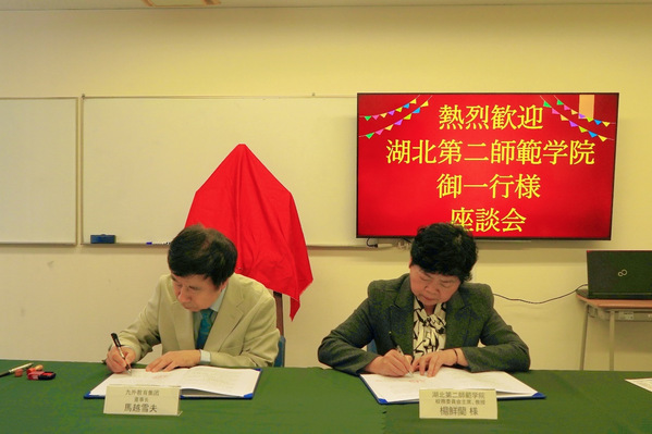 4月14日,代表团访问九州外国语学院并举行会谈。双方围绕教师研修、学生研习交流项目、非语言类专业学生联合培养以及孔子独立课堂联合申报等议题进行讨论,并达成高度共识。会谈期间,双方签订海外实践基地协议书,并举行了揭牌仪式。
