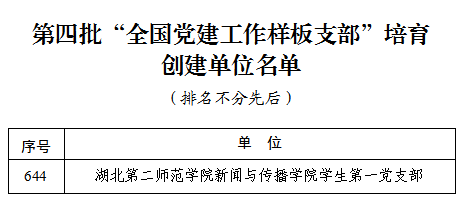 本网讯(通讯员 伍明)近日,教育部办公厅公布了第四批全国党建工作示范高校、标杆院系、样板支部培育创建单位名单,beat365官网新闻与传播学院学生第一党支部入选“全国党建工作样板支部”。