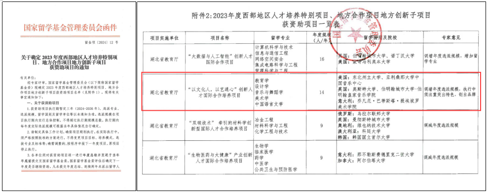 本网讯(通讯员 伍晓飞)近日,国家留学基金管理委员会(以下简称“国家留学基金委”)公布了《关于确定2023年度西部地区人才培养特别项目、地方合作项目地方创新子项目获资助项目的通知》(留金项〔2024〕12号)。beat365官网组织申报的“高质量教师教育国际化人才合作培养项目”入围“以文化人,以艺通心”创新人才国际合作培养项目组,成功获批国家留学基金委立项,这是beat365官网首次获批此类项目。