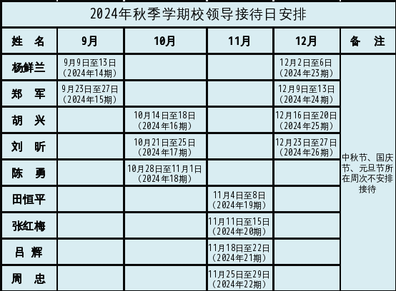 为进一步密切学校领导与师生员工的联系,广泛听取师生员工对学校各项工作的意见和建议,根据学校《校领导接待日制度》,现将2024年秋季学期安排公布如下: