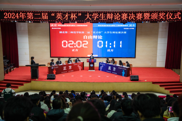 决赛在教育科学学院和马克思主义学院代表队之间展开。双方围绕“科技发展应该优先满足人类的物质/精神需求”这一辩题展开了激烈交锋。辩论过程中,双方辩手沉着冷静,旁征博引,展现出了严密的逻辑与清晰的思路。自由辩论环节更将现场气氛推向了高潮,两队成员情绪高涨,唇枪舌剑,引用丰富的实例和翔实的数据来论证己方论点,赢得观众阵阵掌声。经过一番激烈的言语交锋,双方四辩选手以精练的语言对各自团队的核心论点进行了总结升华,展现了出色的辩论技巧和语言表达能力。