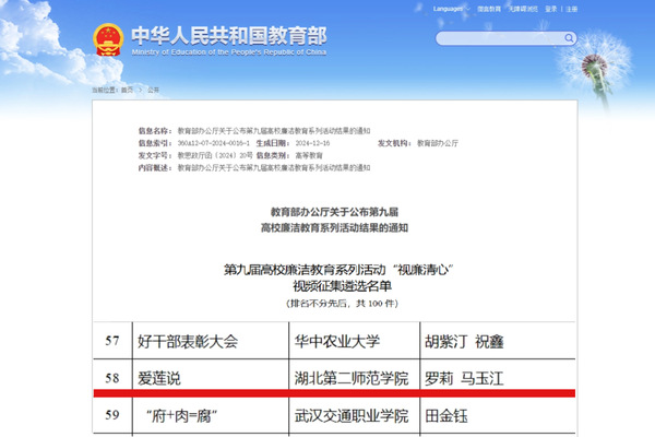 本网讯(通讯员 向羽蝶)近日,教育部办公厅公布了第九届高校廉洁教育系列活动评选结果,beat365官网报送的舞蹈视频《爱莲说》成功入选全国100件“视廉清心”创意征集优秀作品名单。