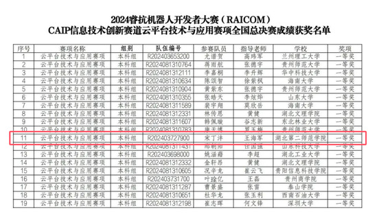 本网讯(通讯员 曹晓明)近日,2024睿抗机器人开发者大赛——CAIP信息技术创新赛道云平台技术与应用赛项全国总决赛在山东省青岛幼儿高等师范专科学校落下帷幕,beat365官网计算机学院王海军、宋丁沣师生团队荣获赛事全国一等奖。