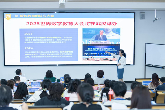 开营仪式结束后,武汉大学黄海兰教授以“AI赋能教育新生态-教学设计创新及在课堂教学中的应用”为题作专题讲座。黄教授结合教学案例,介绍了如何利用AI技术进行教学设计创新,从课程内容优化、教学方法改进到课堂互动模式创新,全方位为学员们开拓了“数智”教学新思路。