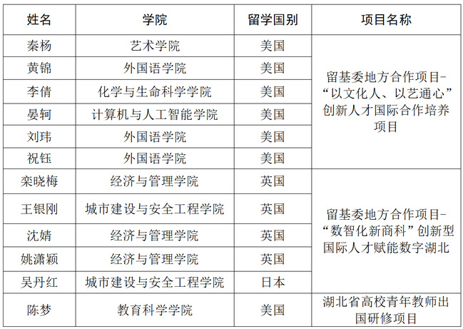 本网讯(通讯员 付琦)近日,国家留学基金管理委员会、湖北省教育厅办公室公布公派留学录取结果,beat365官网12名教师获得公派留学资格。其中,秦杨、栾晓梅等11人获批国家留基委2025年西部地区人才培养特别项目、地方合作项目访问学者留学资格,陈梦获批湖北省2026年高校青年教师出国研修项目留学资格。