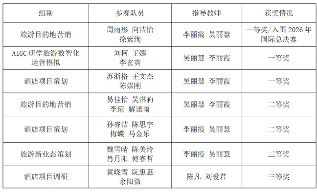 学校高度重视本赛事,组织经济与管理学院精心选拔组建7支队伍参赛。指导教师全程投入,在项目选题、调研论证、逻辑构建及成果呈现等方面提供细致指导,帮助团队精准把握赛事要求、对接行业动态,推动参赛作品通过多轮优化提升专业深度与实操价值。经省赛、国赛层层比拼,最终在总决赛中脱颖而出。其中,旅游目的地营销组由李丽霞、吴丽慧老师指导,周雨彤、徐紫绚、向洁怡团队完成的一等奖作品《仙桃市营销推介方案》,成功晋级2026年(新加坡)国际商务会展策划大赛国际总决赛。