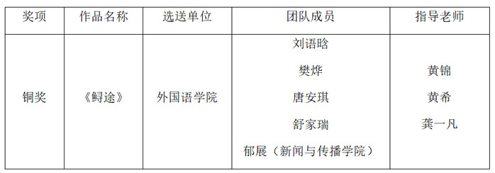 赛项以“美丽中国”为核心主题,团队选取“中华鲟寻友之旅”作为叙事视角,创新采用明暗双线结构:明线围绕中华鲟跨江寻友的历程,暗线映照美丽中国建设的探索之路,在细腻叙事中勾勒出“美丽中国”的多元内涵与深刻底蕴。从主题破题、脚本策划,到音频录制、拍摄剪辑,团队成员发挥外语专业的表达优势与新闻传播专业的叙事特长,彰显跨专业团队的协同作战能力。凭借新颖视角、生动叙事及流畅的外语表达,作品展现出当代中国的发展活力与文化魅力,赢得评委专家高度认可。团队最终脱颖而出,斩获全国铜奖,创下学校在该赛事短视频赛项中的历史最佳成绩。