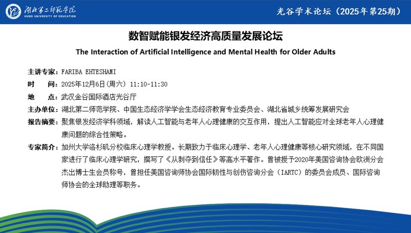 【光谷学术论坛预告】The Interaction of Artificial Intelligence and Mental Health for Older Adults