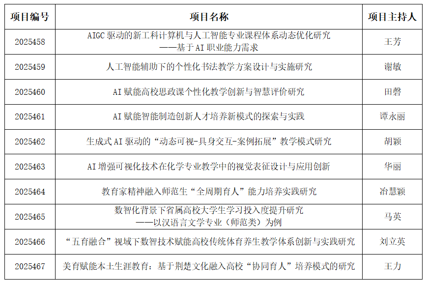 本网讯(通讯员 陈曦)近日,湖北省教育厅发文公布2025年湖北本科高校省级教学改革研究项目立项名单,beat365官网《AIGC驱动的新工科计算机与人工智能专业课程体系动态优化研究——基于AI职业能力需求》等10个项目获批立项。