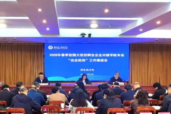 本网讯(通讯员 刘程)3月18日下午,学校在行政楼五号会议室召开2026年春季校园大型招聘会暨企业对接学院专业“访企拓岗”工作推进会,对2026届毕业生“优企引才”定向访企拓岗专项行动进行再动员、再部署。副校长张红梅出席会议并讲话,招生就业处处长刘儒国主持会议。